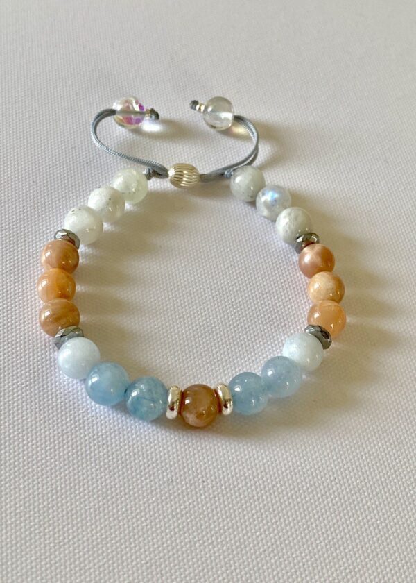 Aquamarin Ay Taşı Güneş Taşı İpli Özgüven Bileklik 8mm | Gümüş Kapama