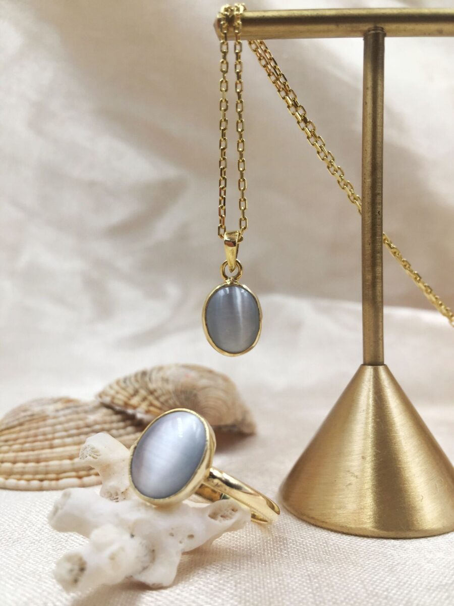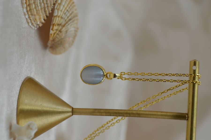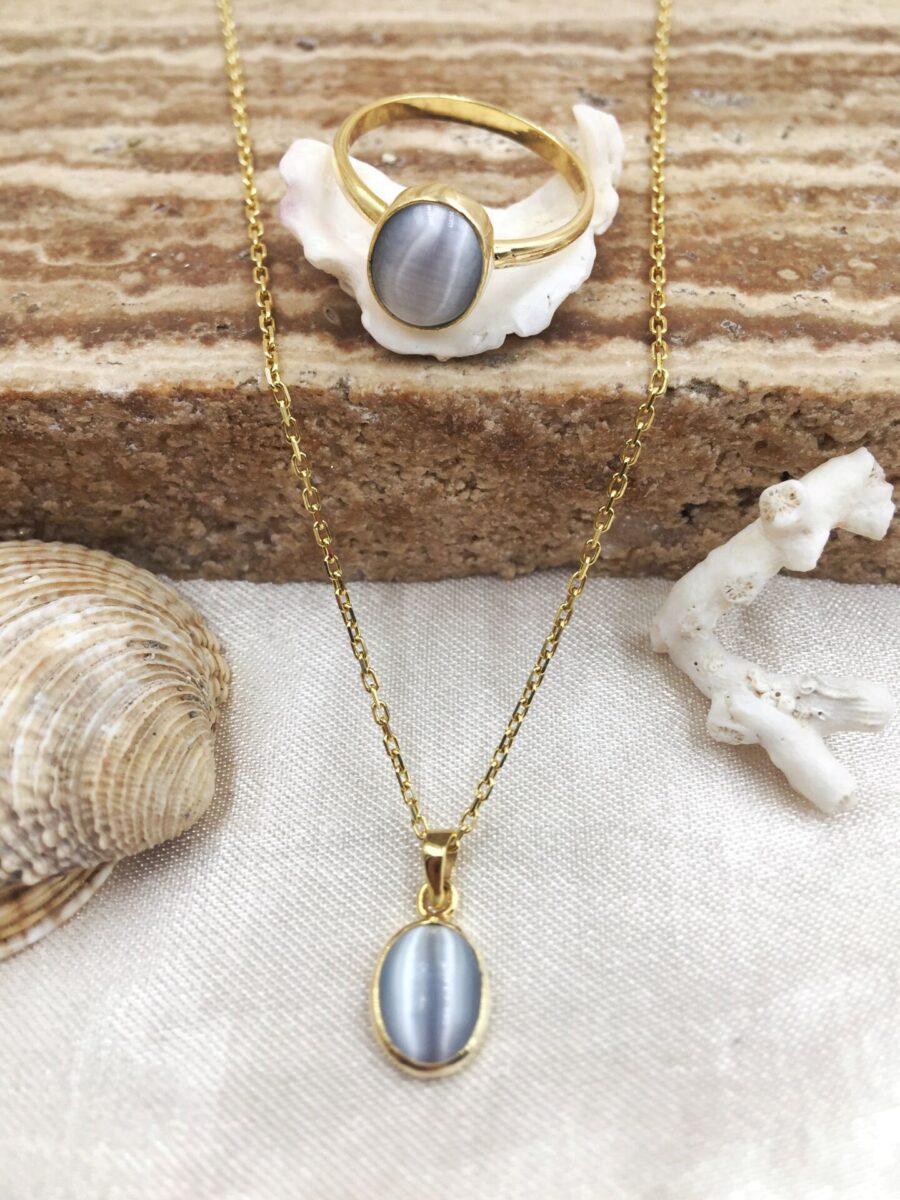 Gerçek Oval Gri Kedi Gözü Kolye | Altın Kaplama 925 ® Gümüş