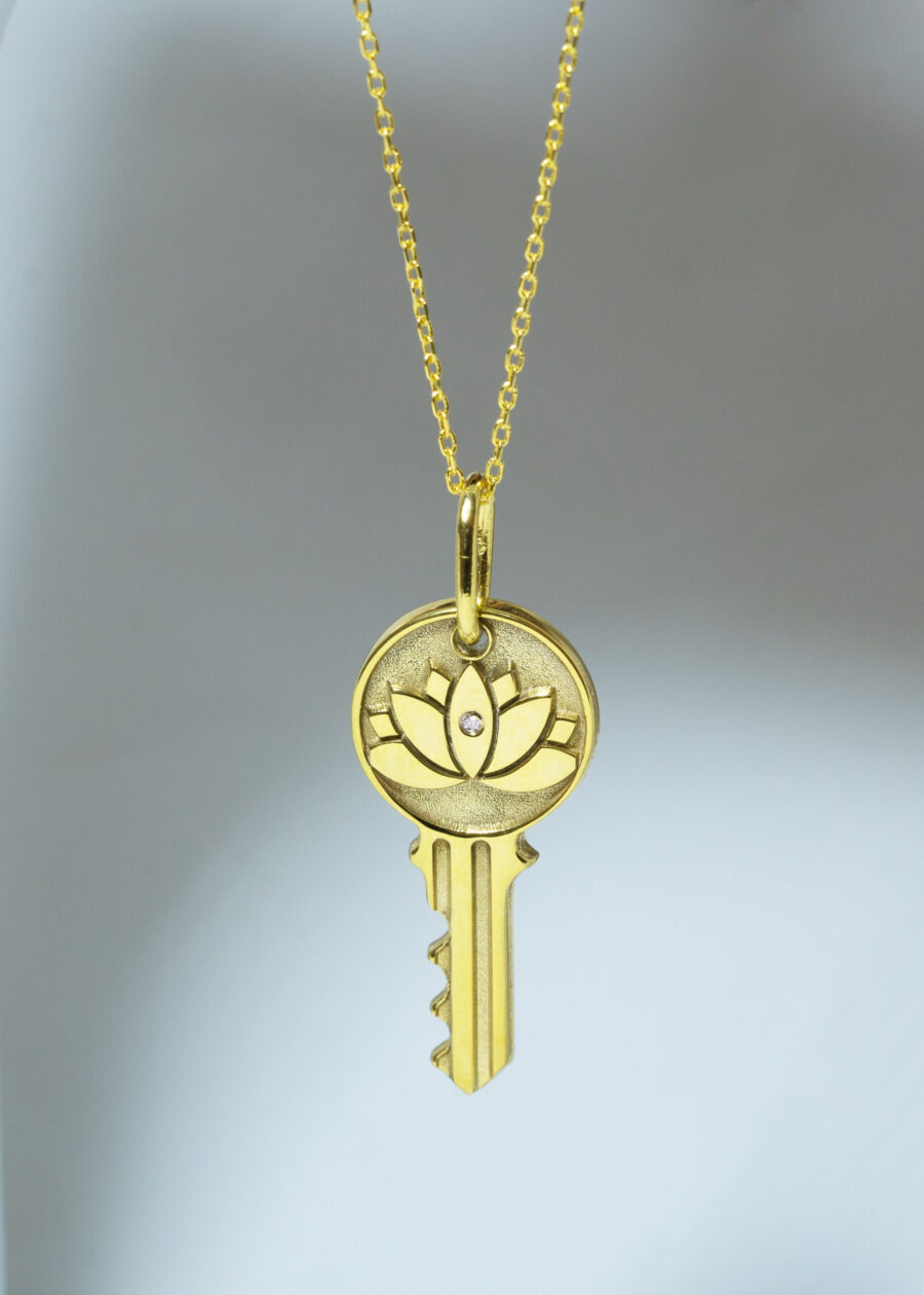 Lotus Sembollü Pembe Kuvarslı Ve Aşk Sekanslı Altın Kaplama Gümüş Anahtar Kolye