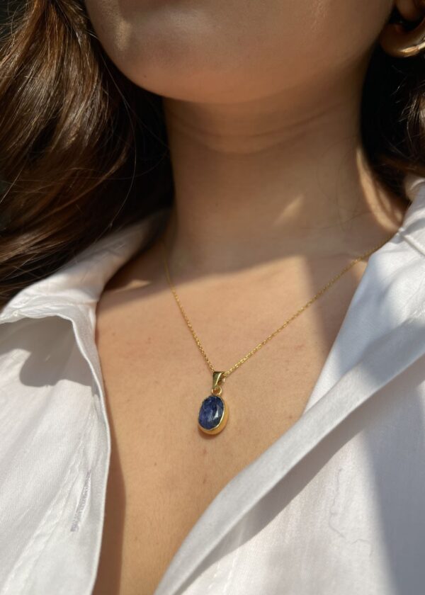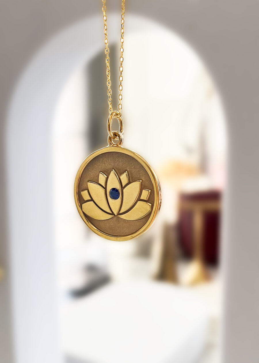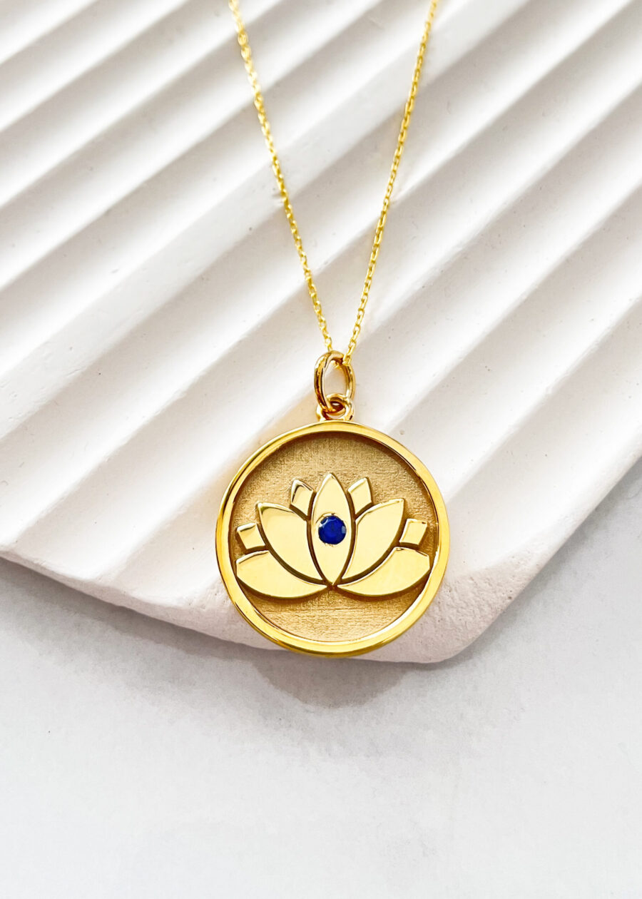 Safir Taş Detaylı Lotus Sembollü Gümüş Kolye | 22K Altın Kaplama